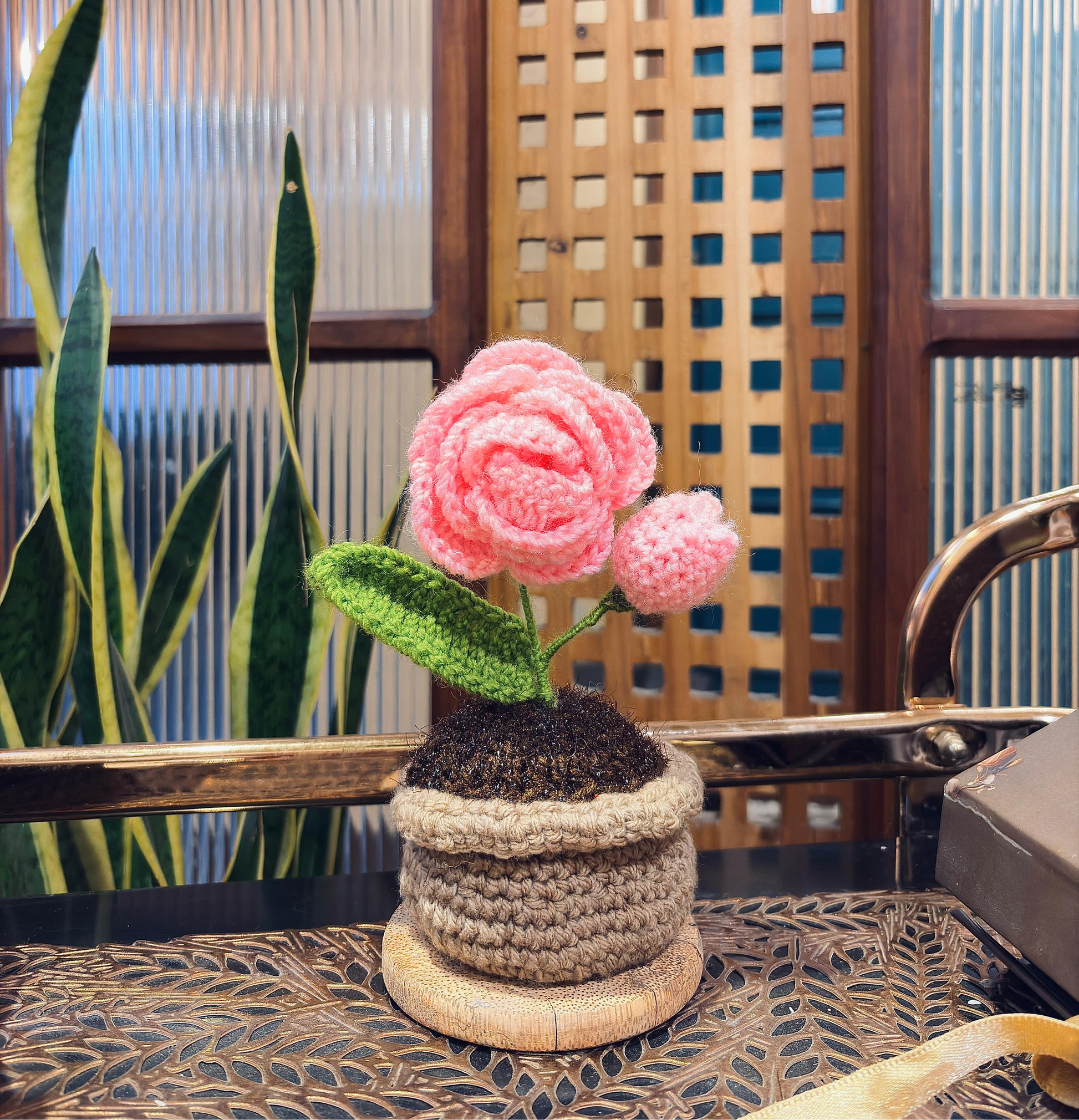 HANDMADE CROCHET ROSE FLOWER POT (pink)